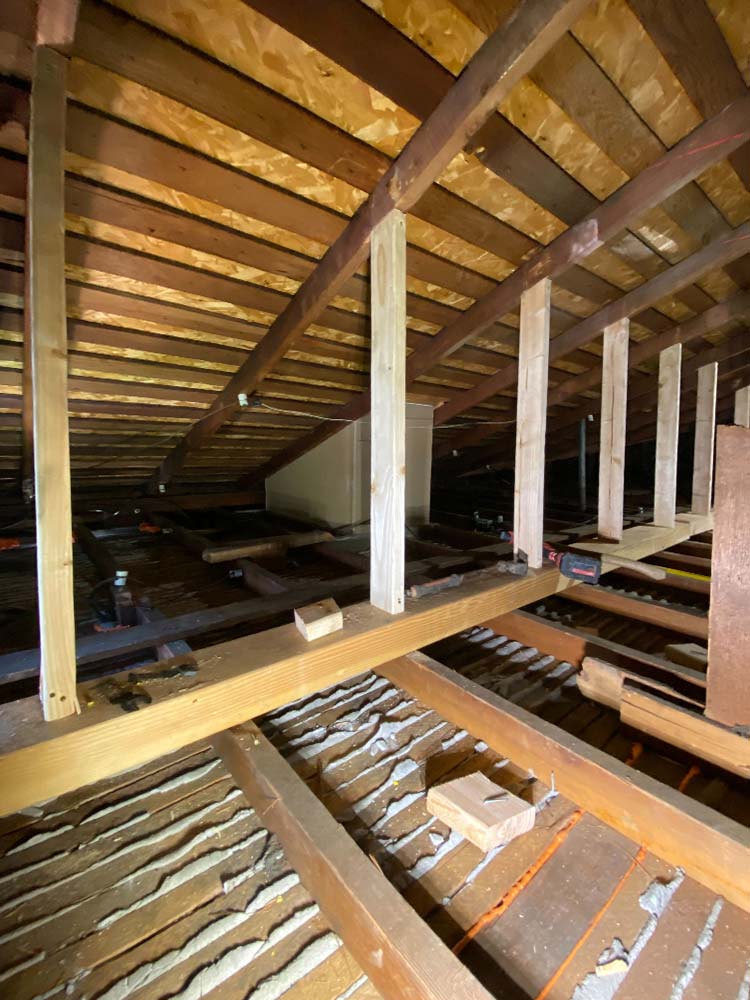Reinforced attic trusses and roof framing in a Seattle home by installing vertical kickers, collar ties, and blocking, repairing cracked rafters, and adding optional storage, restoring structural integrity and long-term roof stability.